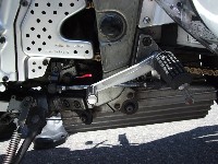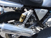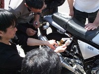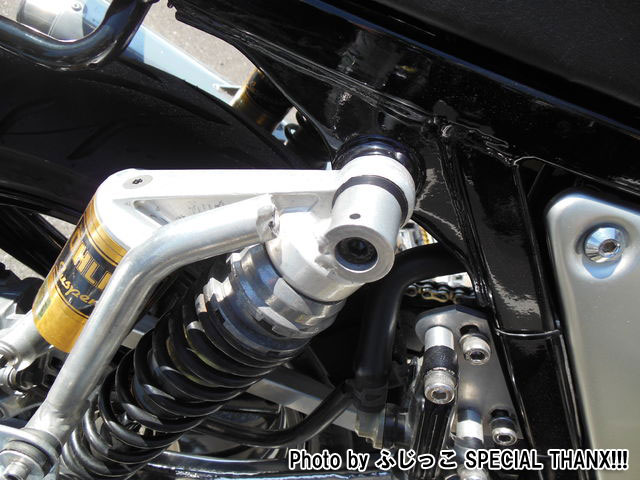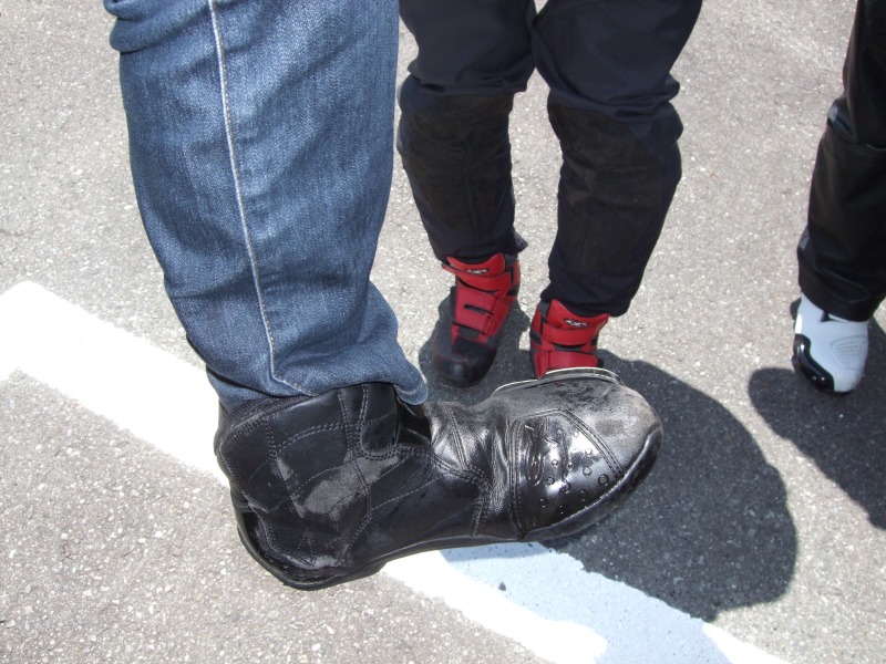 トム蔵氏はキャブセッティング&Oil漏れw ブーツべとべとですw タイアに付着しなくて良かった。 彼のマシンはシフトのガタ低減のため、ホンダCBRのリンケージシャフトを流用しています。 ナチュラルな仕上がりですが、加工には「むちゃくちゃ苦労した」そう。