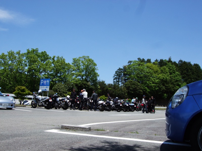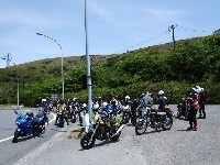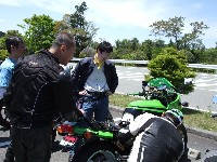 全身黒づくめ&ミラーシールドが迫力。しま氏。 カメラ目線を超えてガン見状態の、ふじっこ氏。こっち見んな!的なw 検切れ間近、次週は全国オフだよ車検間に合うかなどきどきingな寅楠氏。