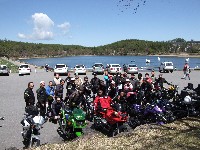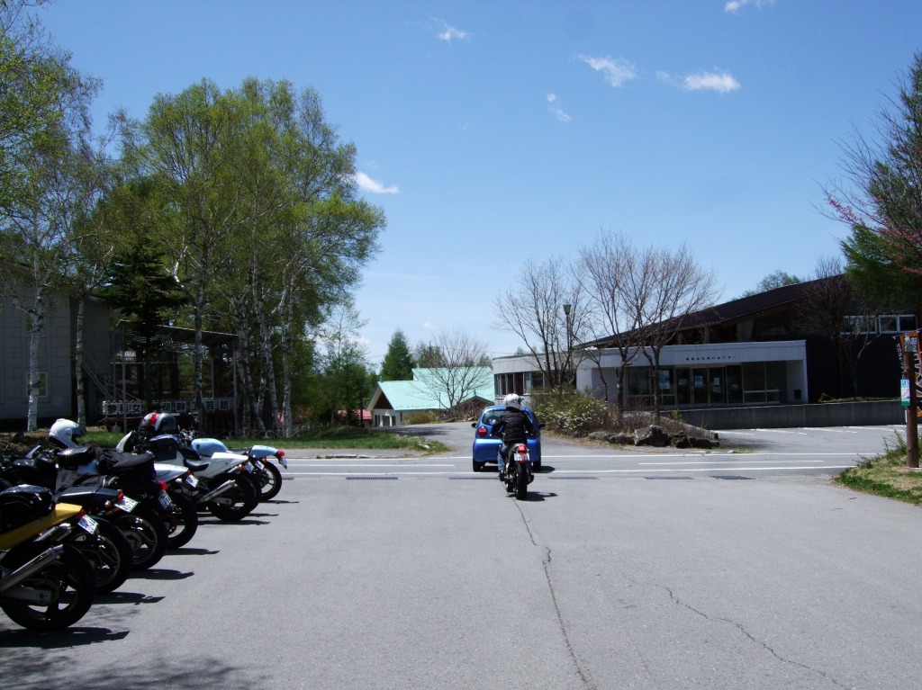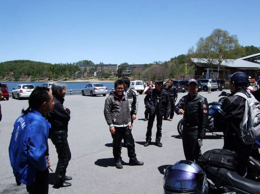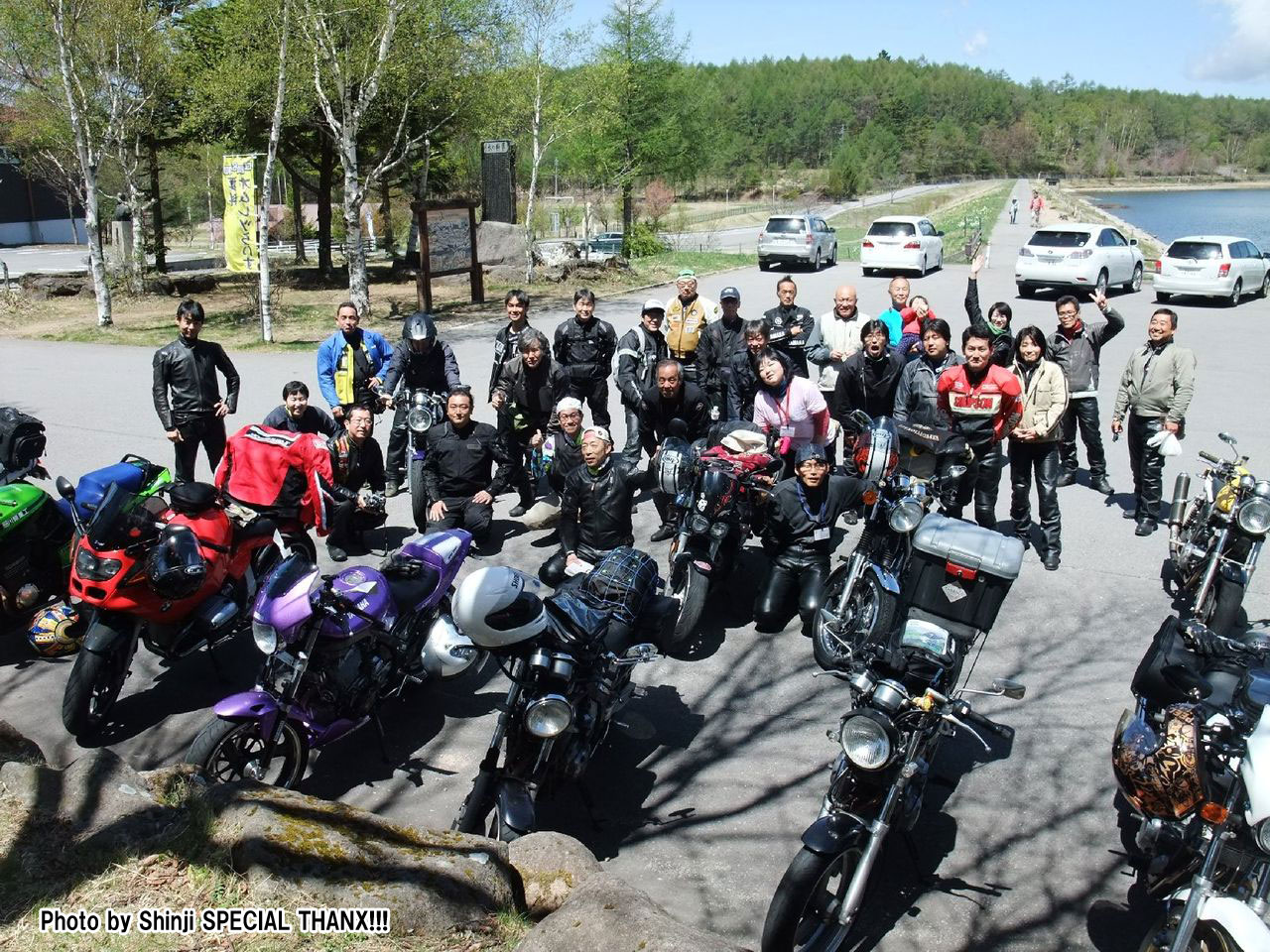 AM10:20 Shinji氏の案内で女神湖の駐車場に着くと、誰もいない…。 集合写真どん!(縮小するとみんなの顔わからんなるから、元画像UPしちゃった。) |