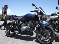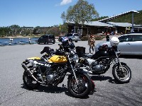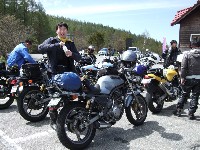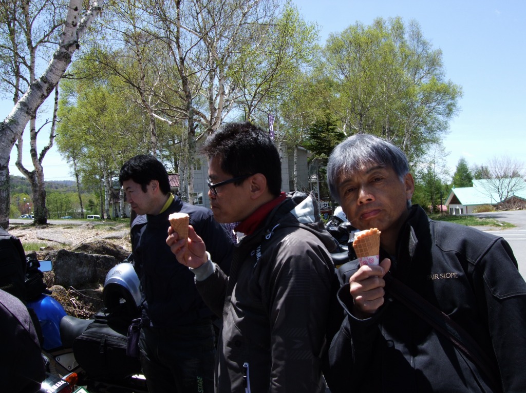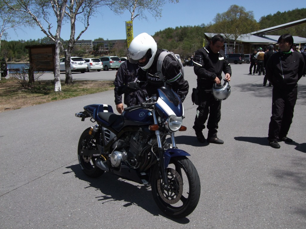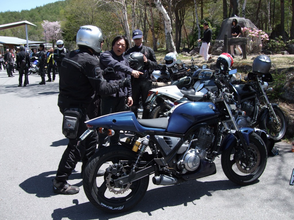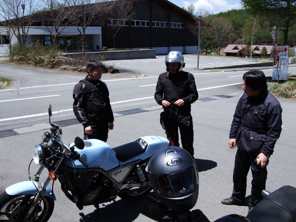 ちーさん&だるちゃん+ゆっきーくんは高速が混む前にお帰り。 ツーリングは一般道かつワインディングが大前提、 Who?(誰のことだ) ––– 絶賛ソフトクリーム中のふじっこ氏とShinji氏。 自家塗装によるインターカラーが特徴、SAM氏のマシン。 |