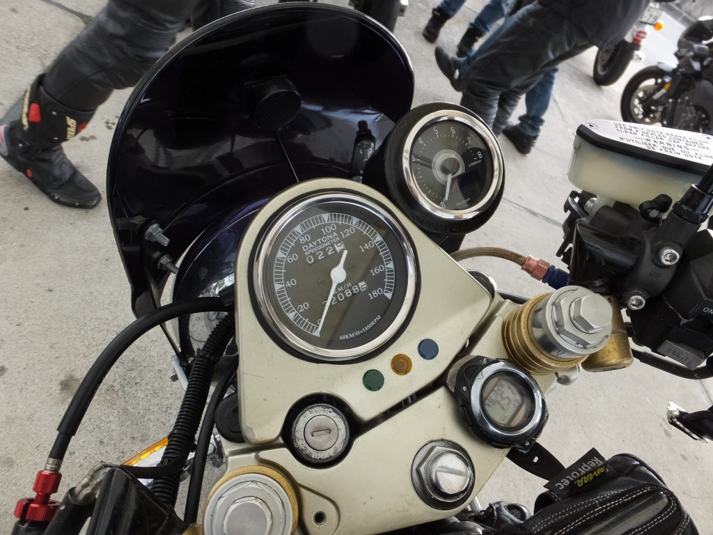 | 初参加のKen氏。K社のリッターにも乗っておられるそう。 社外製のシックなメーターがええ感じです。今はこんなん売ってるんだなあ。 こちらは魔改造倶楽b…バイク屋『BS-Factory』を営むBSF氏のマシン。 |