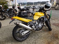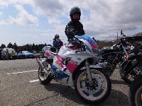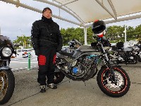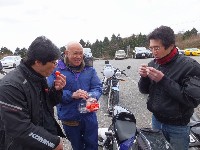 レストハウスで入手した苺でオサーンたちを餌付けする鳴神氏。 本日はBMWでおいでのmadamada氏。こないだは'70年代のBMWだったような…。 バブルとレプリカブームの最後の遺産、FZR400RRでの参加はETC氏。 |