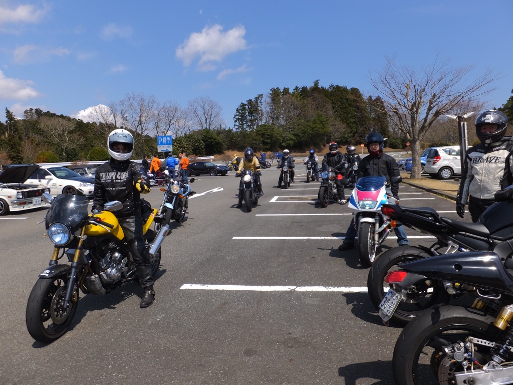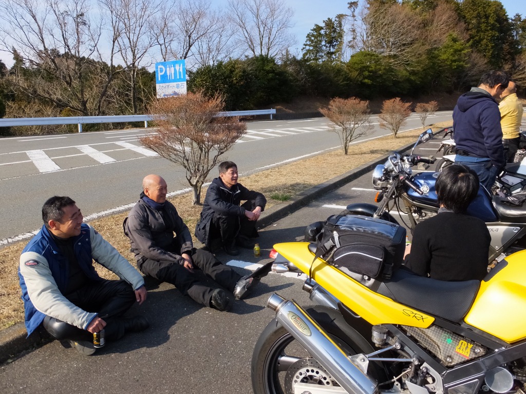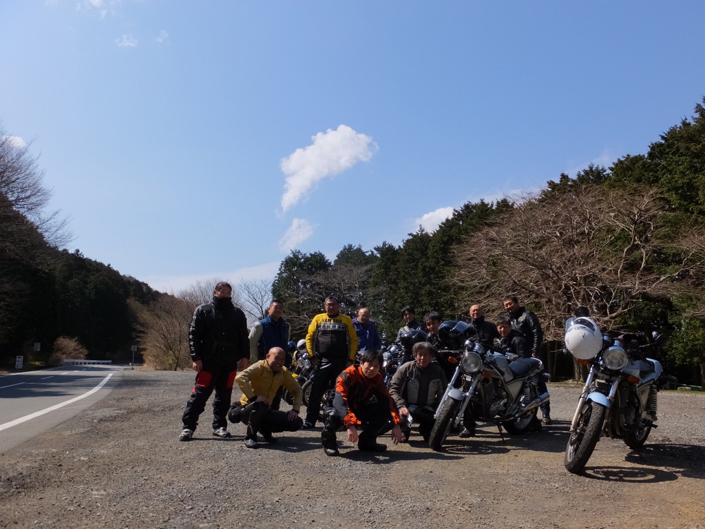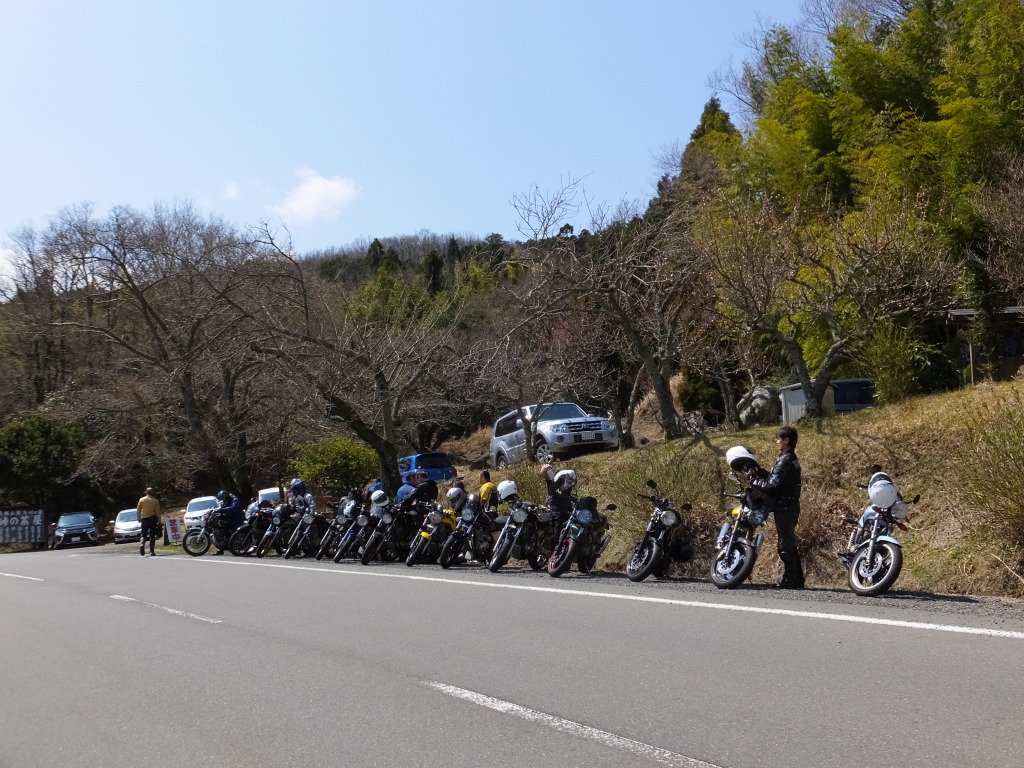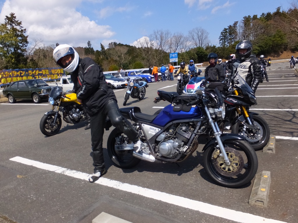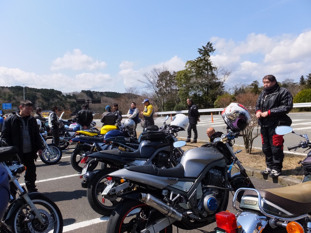 おなじみ、『峠の茶屋』にTELいっぽん入れて、民族大移動開始です。 ずらりと並んだSRXの隊列は僕らには見慣れた光景ですが、 SRXのようなフェミニンなマシンでも、 |