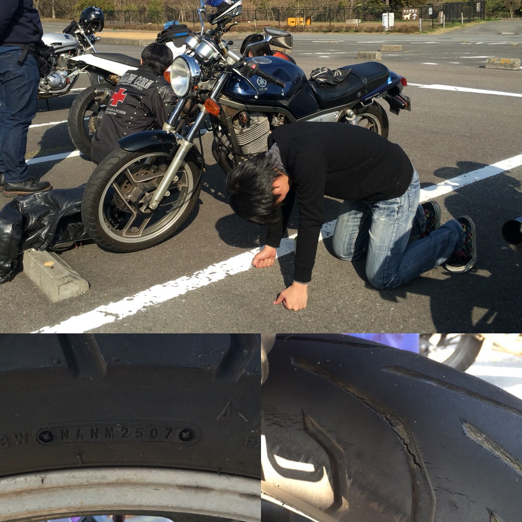 それにしても、特に飛ばすわけでも無理するわけでもないサマンサくんが転倒とは意外です。 タイアの溝がなんだか多いよ!てゆーかヒビじゃん!? 製造年月が2007年(9年前)ですよ! そりゃコケるわw |