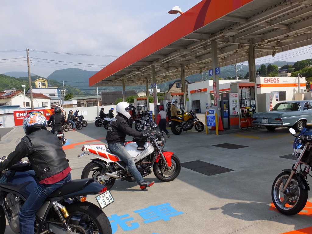 西湘PAから椿ラインの麓までにあるGSでいちばん入りやすくて、 大きいのがこのENEOSなのですが、あっさり満杯w グッドライダーは峠道に入る前に、温間でタイアの空気圧を再チェックするですよ!