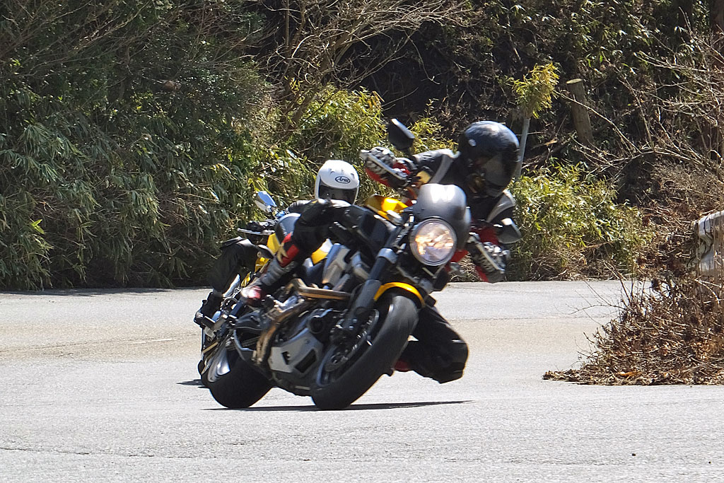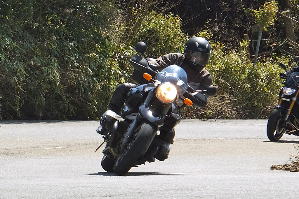 ピンボケご容赦。コンデヂ走行写真のコーナーです(ぱふ) 先ずはこの春、MT-01をゲトして、「オトナスイッチ」を手に入れたtakaちゃん。 続いては5R氏。今回はSRXで登場。 浅めのバンク角で膝を擦る妙技をお持ちのnakamura氏。 |