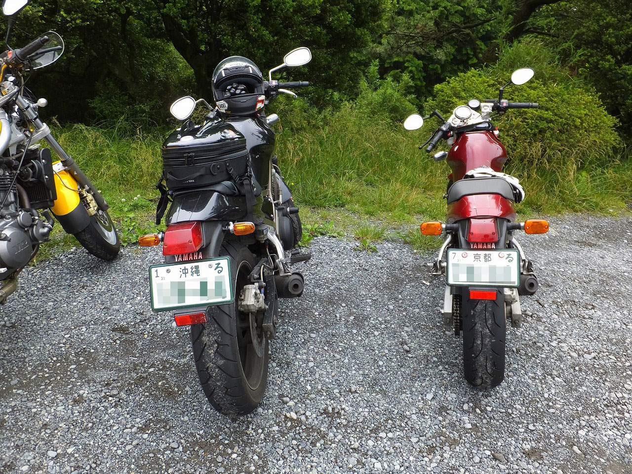伊豆スカイライン熱海峠入り口。 沖縄から自走参加(嘘です)のシューくんと京都から下道自走で参加(嘘です)の吉松さん。 |