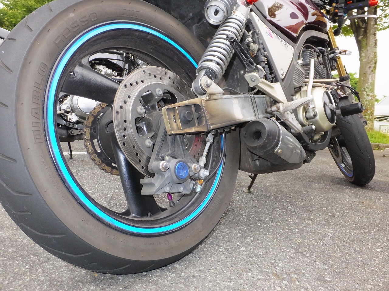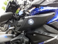 スイングアームの太さでは、寅楠氏も敗けていません。 めってぃくん(うちのIMEは‘滅ティ’と変換する。IME酷い…)のリアフェンダーレス、 maczamu氏のMT-10は、音叉マークの裏側にLEDを仕込んで発光。地味に手間かけた逸品! |
