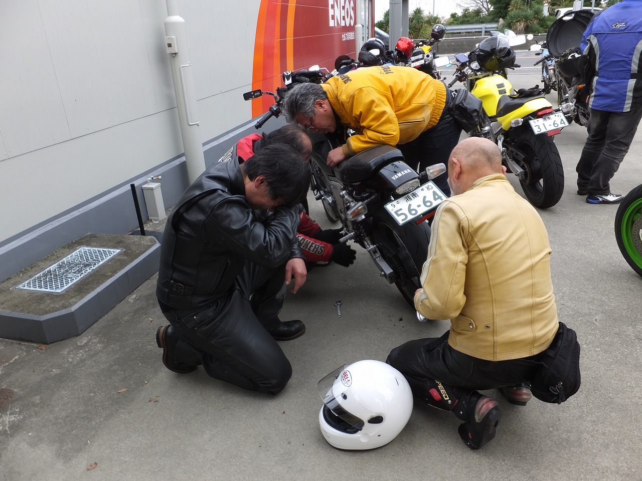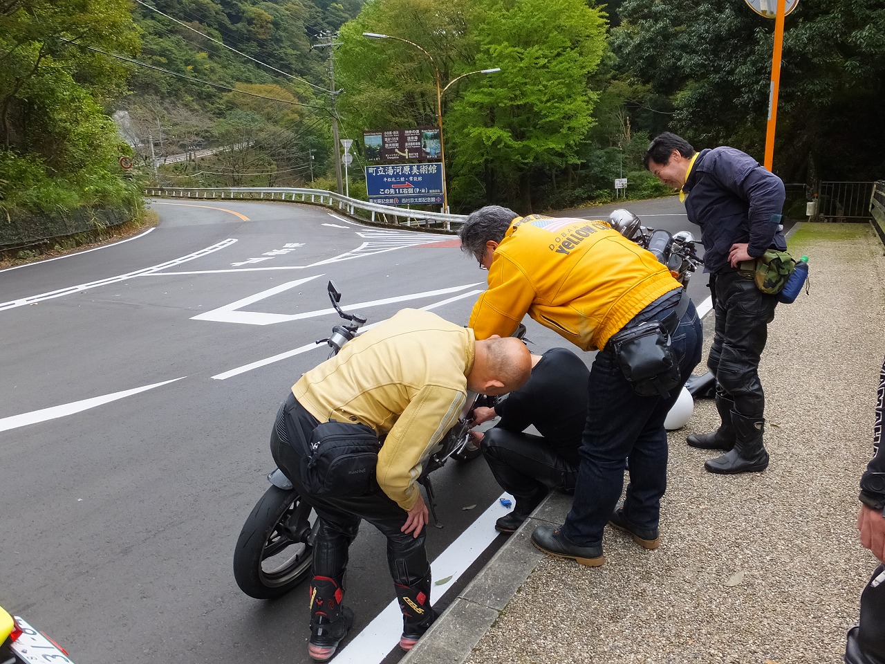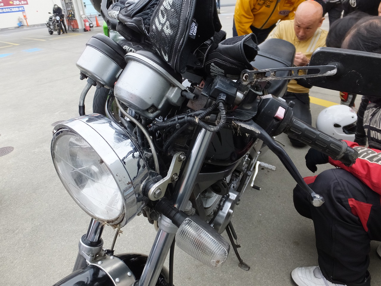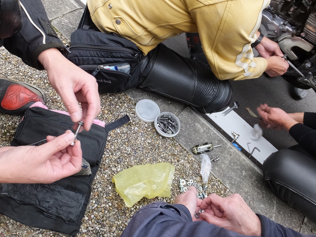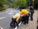 幸い、ライダーはかすり傷でバイクも大きなダメージはない模様。寄ってたかって応急処置。