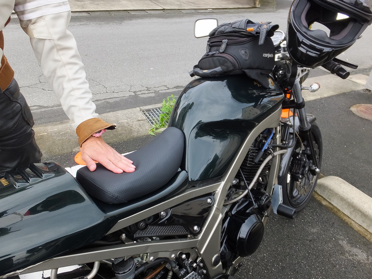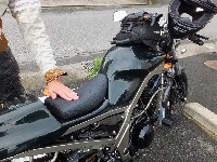 不安に思いつつ第一集合場所のコンビニに到着すると、 ベン太郎氏はステイホーム期間中に作成したおにぅのシートのデビューツーリング。 |