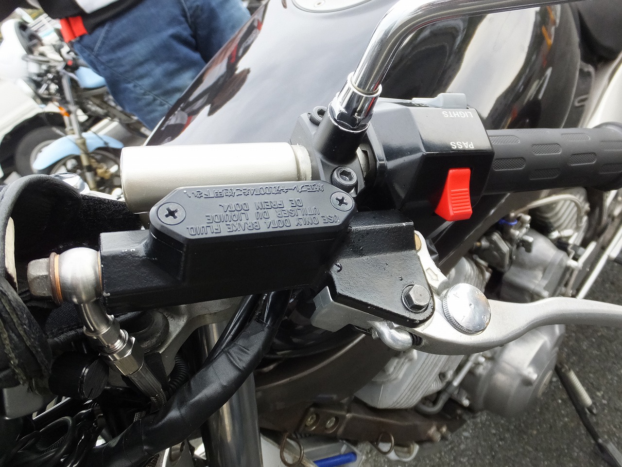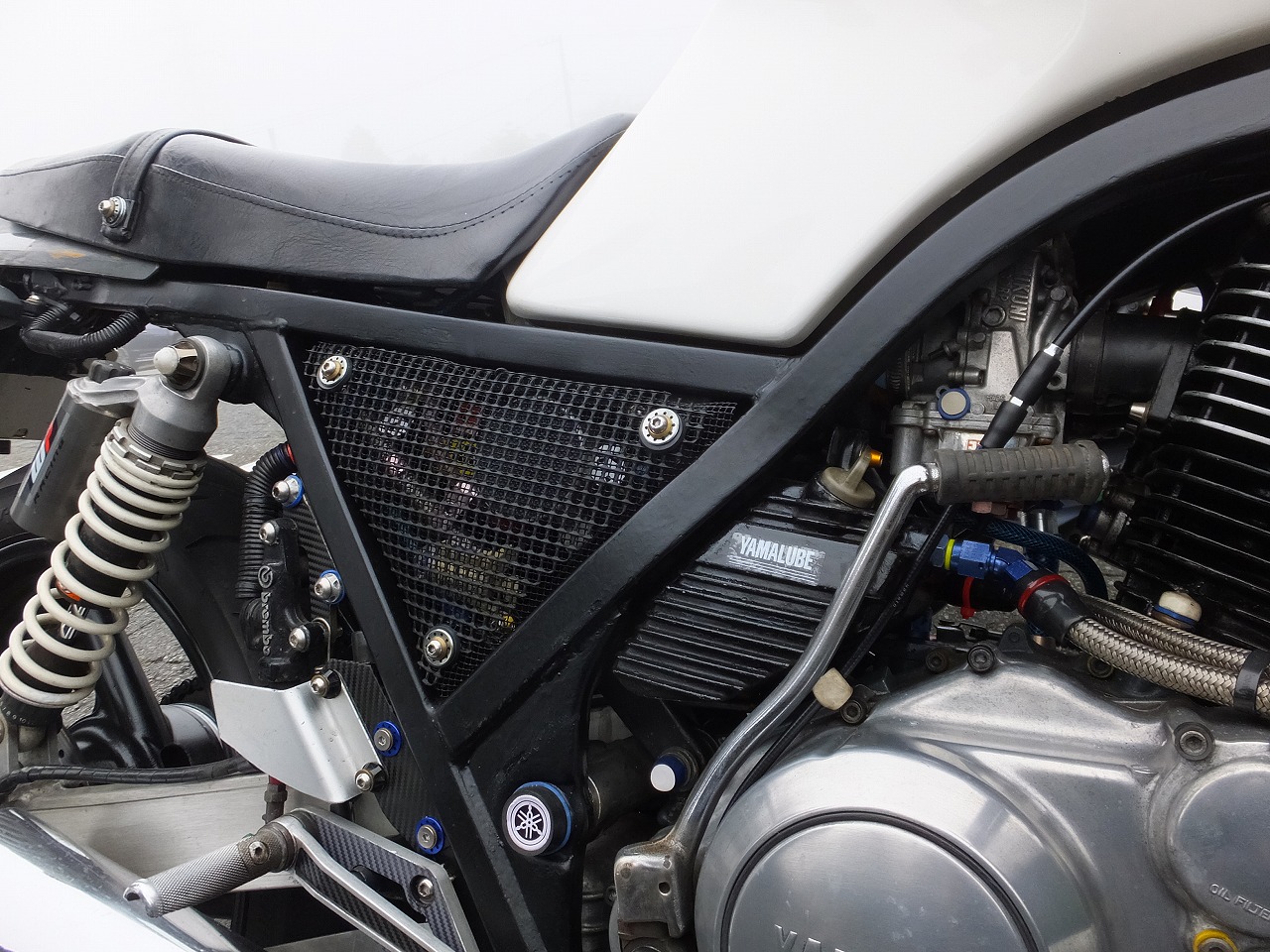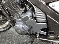 ホームセンターで購入した園芸用品をカットしたサイドカバーは、 めってぃくんはtakaちゃんのMT-01にお跨り。 |