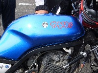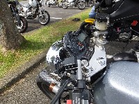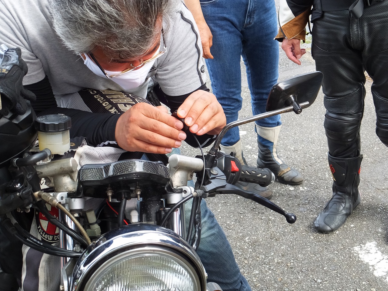 AceWellの電動タコ&スピードメーターをスマートに納めるハヤシ氏のマシン。 ビッグシングルのステキバイブでETCのアンテナステーが折れちゃってました。 ●'s GEARで売っている同じタイプのステーを検討してたんだけれど、 ちょっと考えちゃうな(笑)