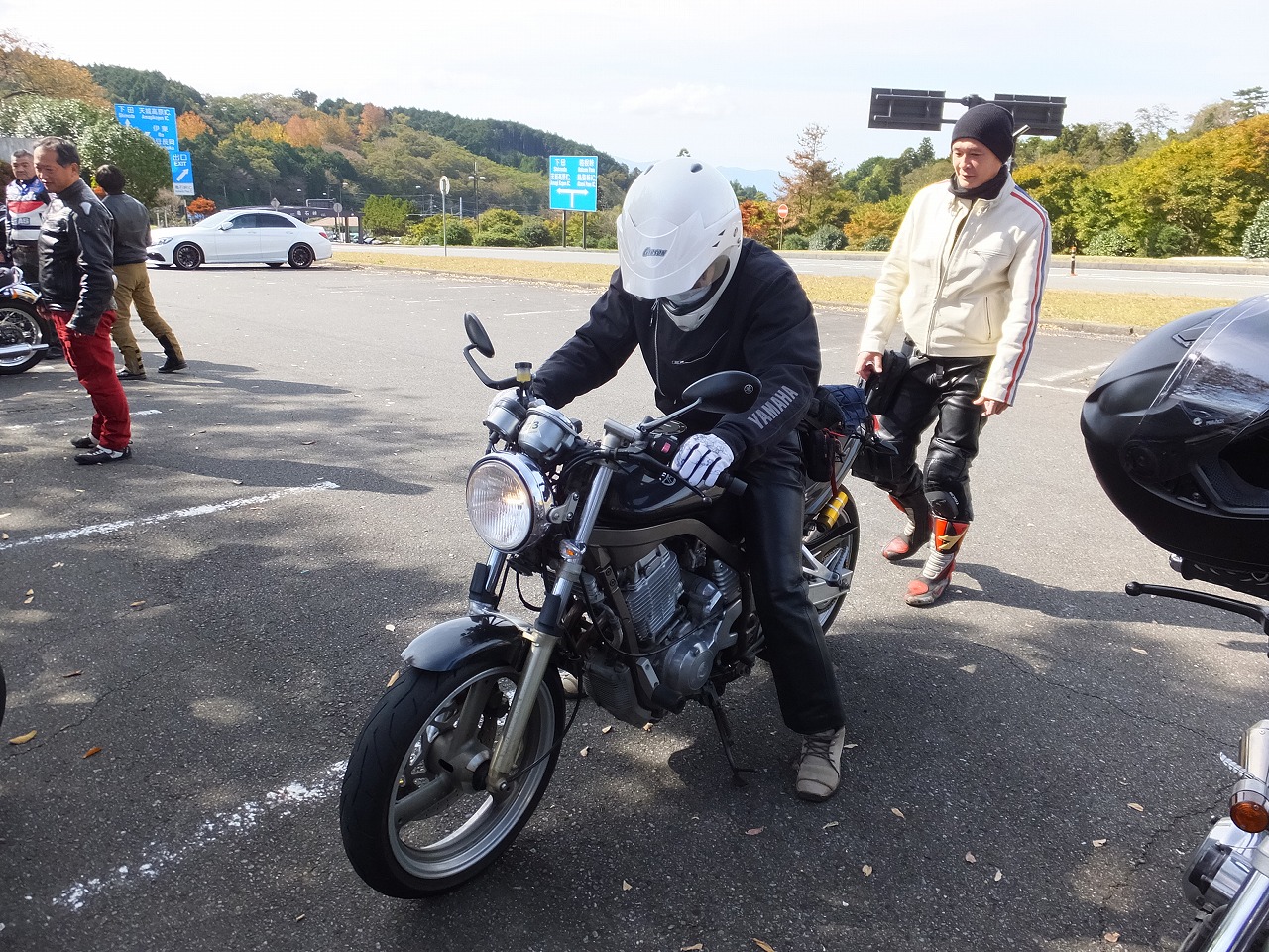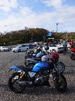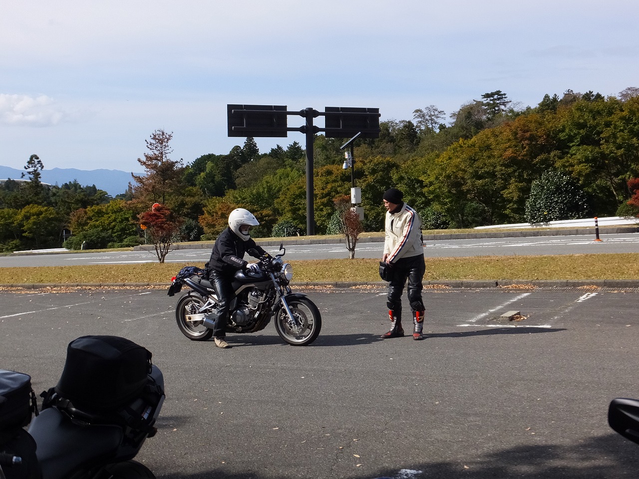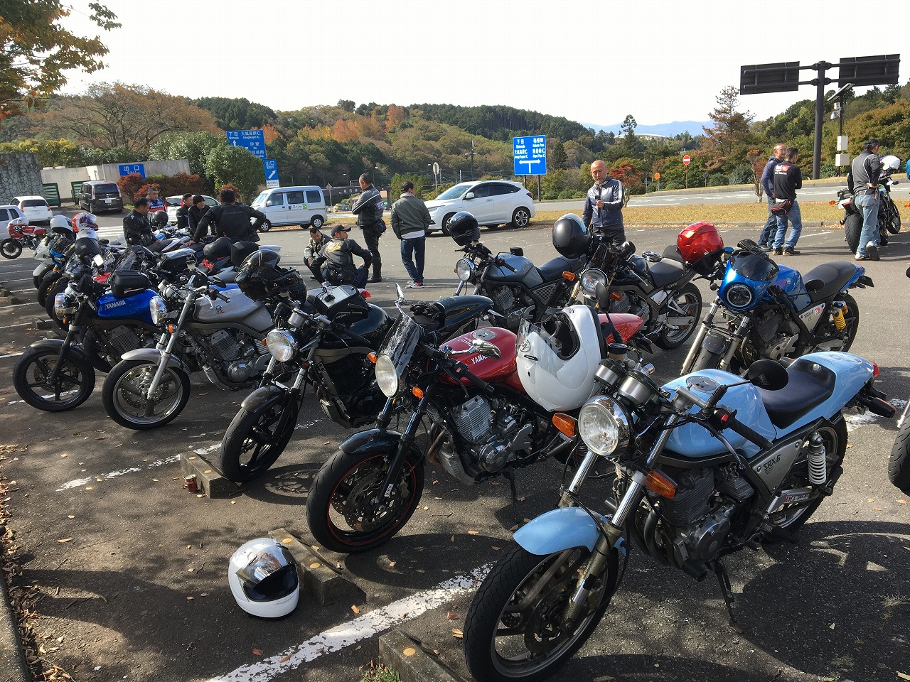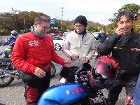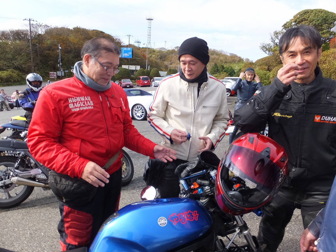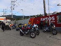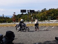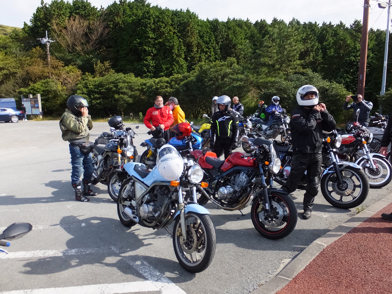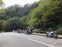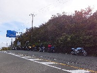 久しぶりに。実に久しぶりにワインディングを快走して亀石PAに到着のman3ご一行。 一年ぶりに33氏登場。トレードマークのオフ用メットも健在。 |