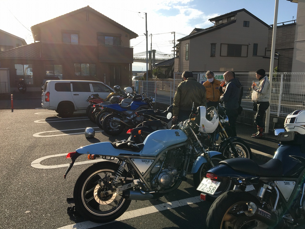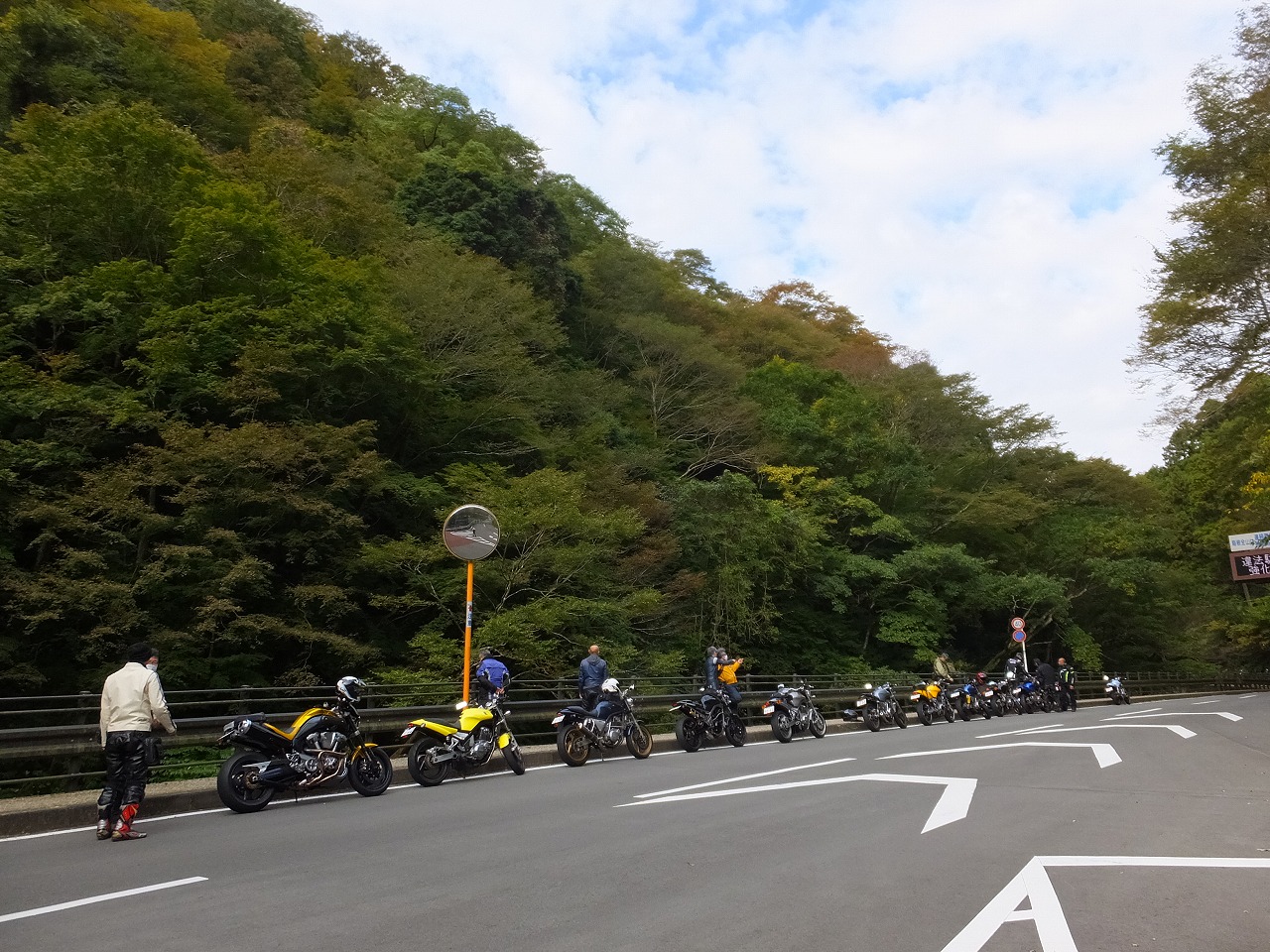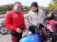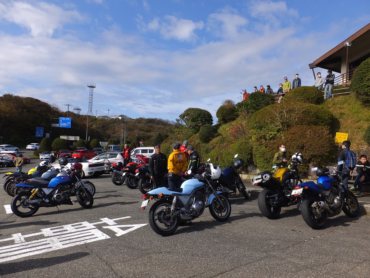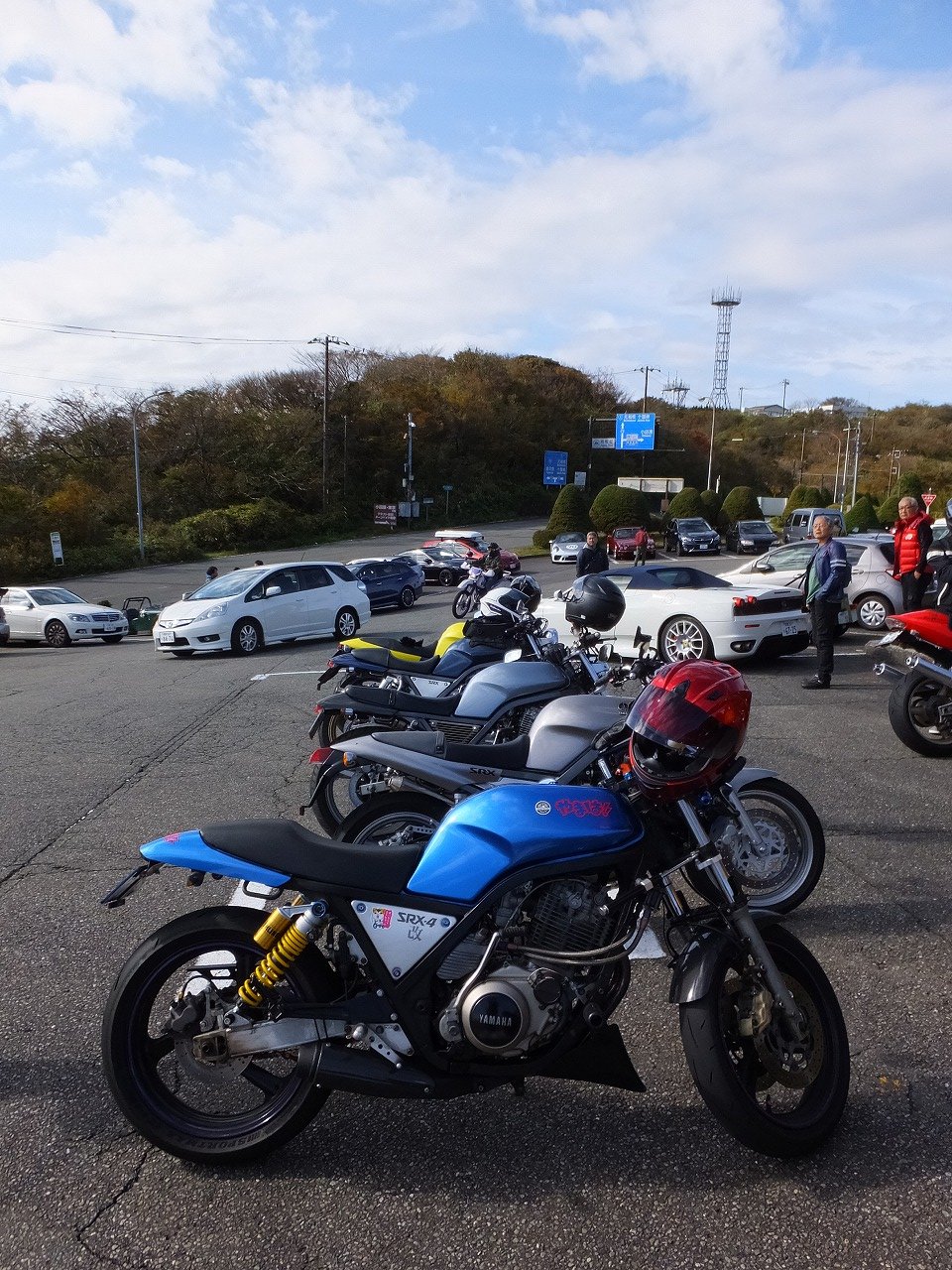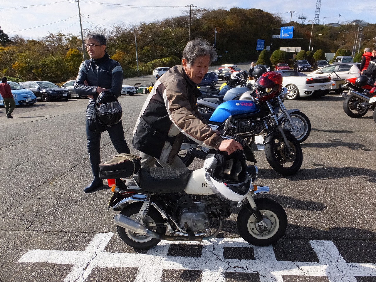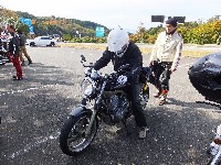 久しぶりに。実に久しぶりにワインディングを快走して亀石PAに到着のman3ご一行。 一年ぶりに33氏登場。トレードマークのオフ用メットも健在。 |