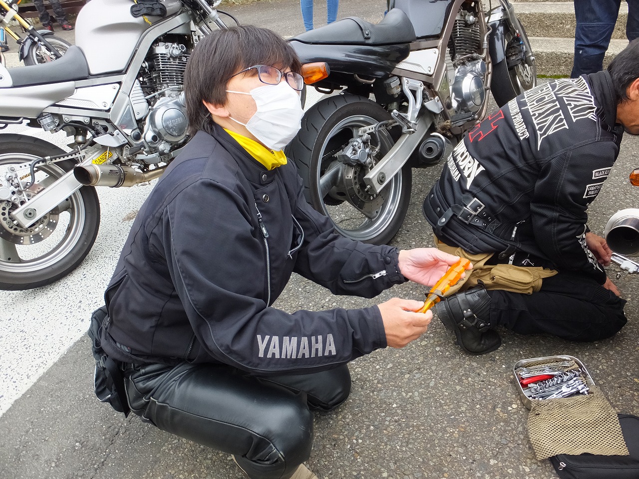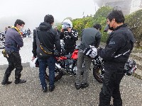 マシントラブルで遅れていたBSF氏、どうにか自力で上がってきました。 トラブル対応中のBSF氏に何故か恍惚の表情でパンク修理キットを手渡そうとする33氏。 |