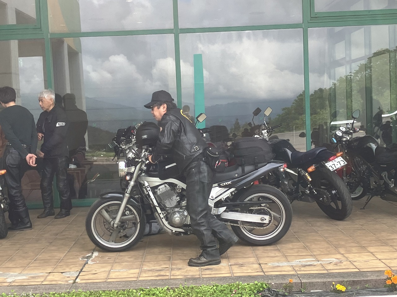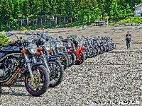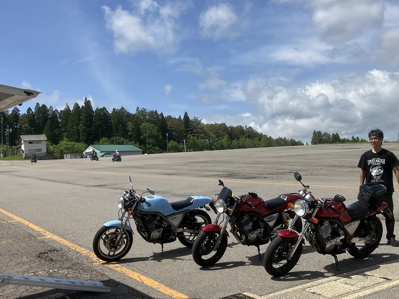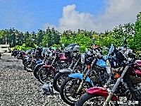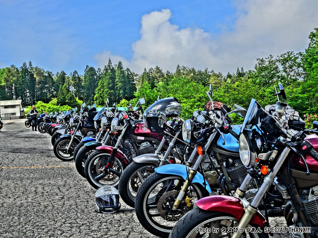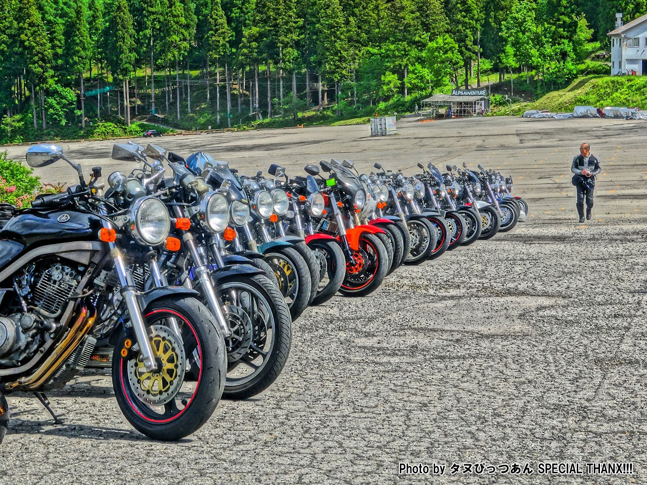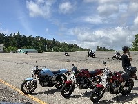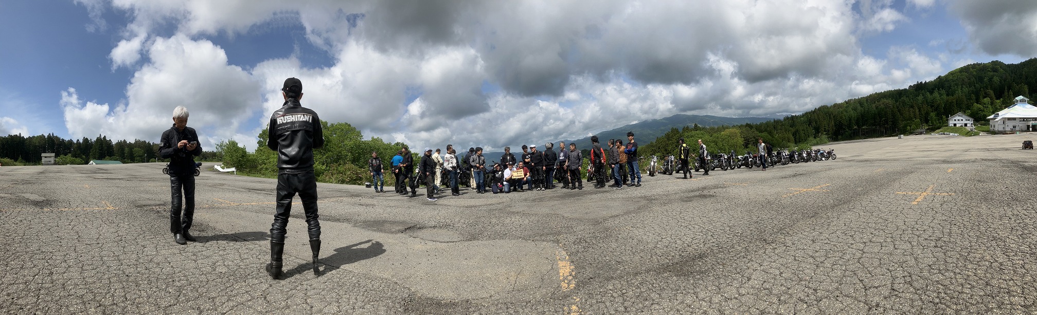 広大な駐車場でバイクを並べて集合写真。似たような写真並べてすみません。