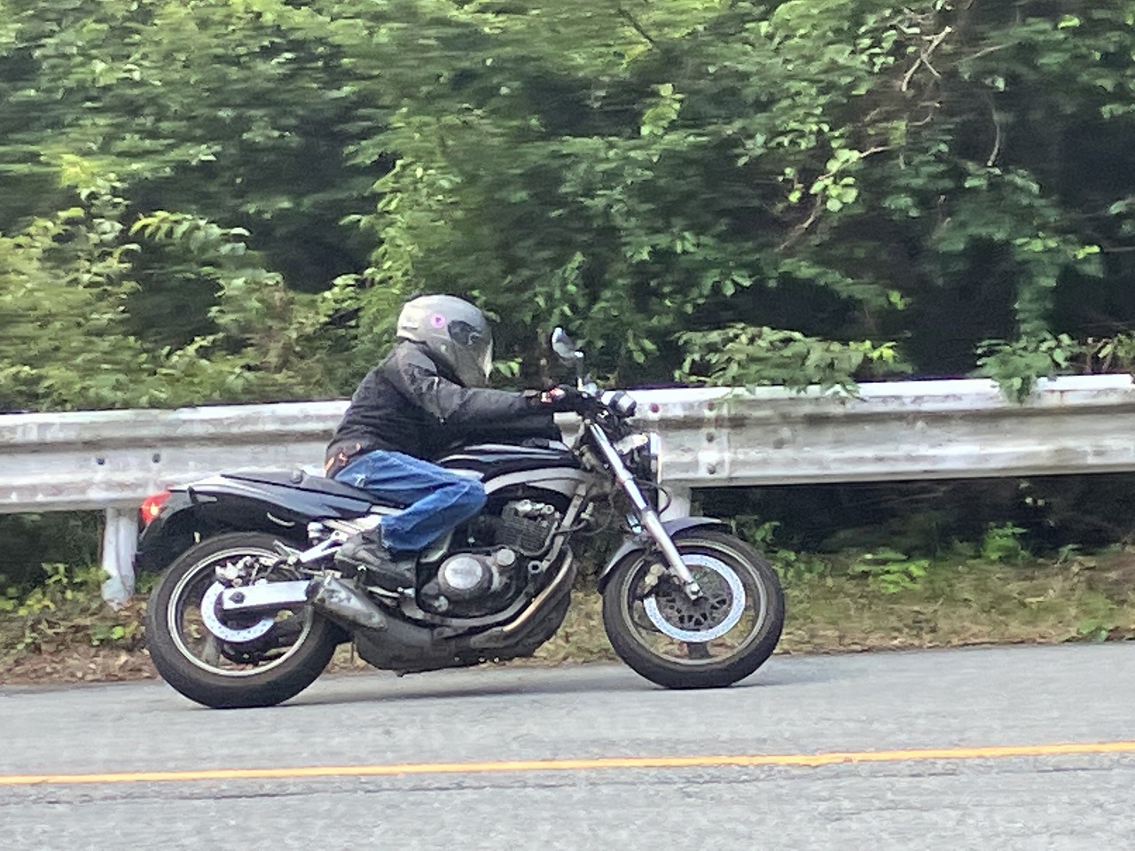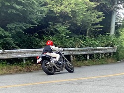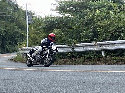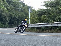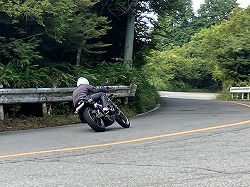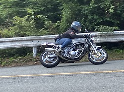 kamu氏のバイクの特徴は、誰よりも汚いことです。汚さ故にすぐわかる(笑) 同じ黒のIV型ですが、イマニシ氏のマシンはたっぷり愛されて生来の美しさに磨きがかかっています。 まいど大観山までの参加はFish eye氏。250で伊豆スカはちょっとキツいらしい。そーだよね。 |