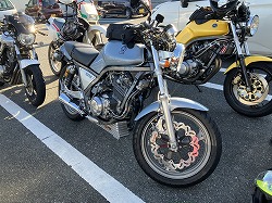 念入りにメンテされた車体と昭和な積載のコラボがイイ感じなTickler氏の900SS。 いまどきの若いこは、タンクバックも網ネットも殆ど使いません(笑) わざわざ伊太利亜から取り寄せたとゆうスポークホイールは三十万円もしたそう…。