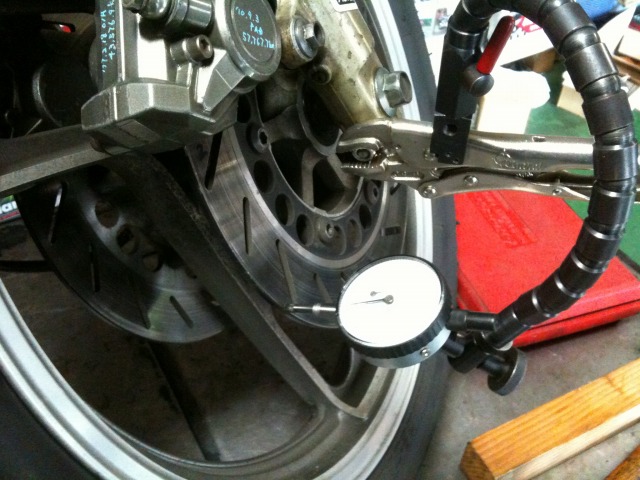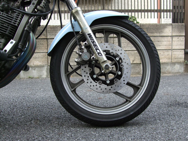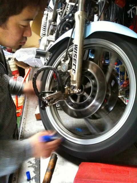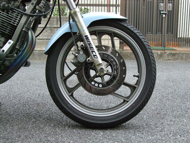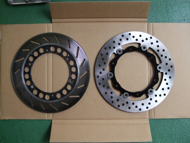 極低速域で生じるフロントブレーキのジャダーは、そらいろ号の持病である。 症状が現れるのは停止寸前、速度にして5〜10kmぐらい。 ブレーキレバーに軽く手を添えていると、かくかくと断続的にブレーキの感覚が抜ける。 症状が出るようになったのは、サーキット走行をするようになってからだから、 原因は、ハード(?)・ブレーキングによるディスクの熱歪みだと思う。 知人から貰った程度の良い中古に交換することで一時的に回復したが、すぐ元に戻ってしまった。(ちなみにパッドも純正である) やっぱりこのディスク、だめだ。