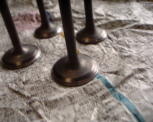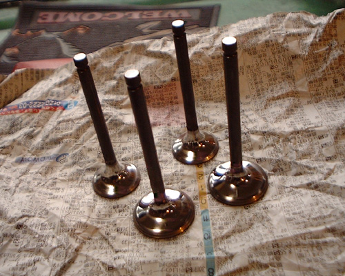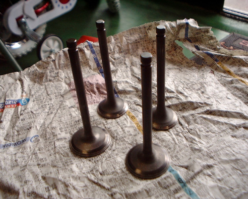 で、こちらは内燃機屋さんで擦り併せ済みの新品バルブ。 当たり巾はマニュアル指定より若干狭くしてある。およそ0.8mmといったところ。 狭い方が面圧も上がって、しっかりした圧縮が稼げるのだ。どうせすぐ広がっちゃうけれど。 ついでにちょっと色気を出して、バルブに鏡面仕上げを施すことにした。 |