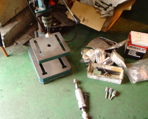 ボール盤にバルブを組み付け、エアリューターで磨く。 このHPを訪れている人にはお馴染み(?)のHu-techで、工具と作業環境をお借りしました。 はっきり言って営業妨害です。すみません。 |